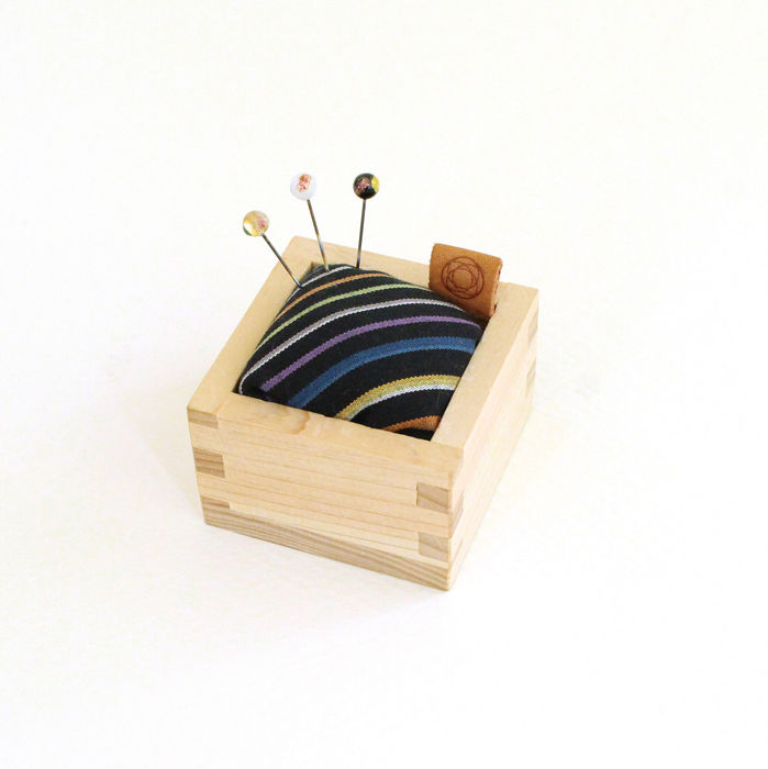 地域産業や工芸にこだわった上質なハンドメイドの道具ブランド「Cohana」とのコラボレーション。香り豊かな国産のヒノキを使った枡に、小倉 縞縞のテキスタイルをあしらった針山。